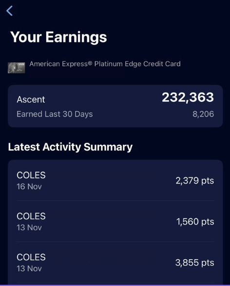 I recently purchased 10 gift cards during the Coles promotion which earnt me 20,000 Flybuy points equating to 10,000 velocity points and additionally I used my AMEX Platinum Edge credit card to pay for all of them, earning me an additional 7,500 AMEX reward points.
