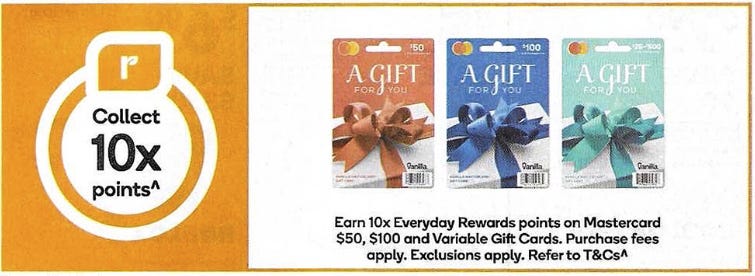 So the trick with this method is to purchase the gift cards when Coles and Woolworths are running promotions on them for bonus Flybuy or Everyday Reward Points. Examples of recent promotions that both Coles and Woolworths were running below: