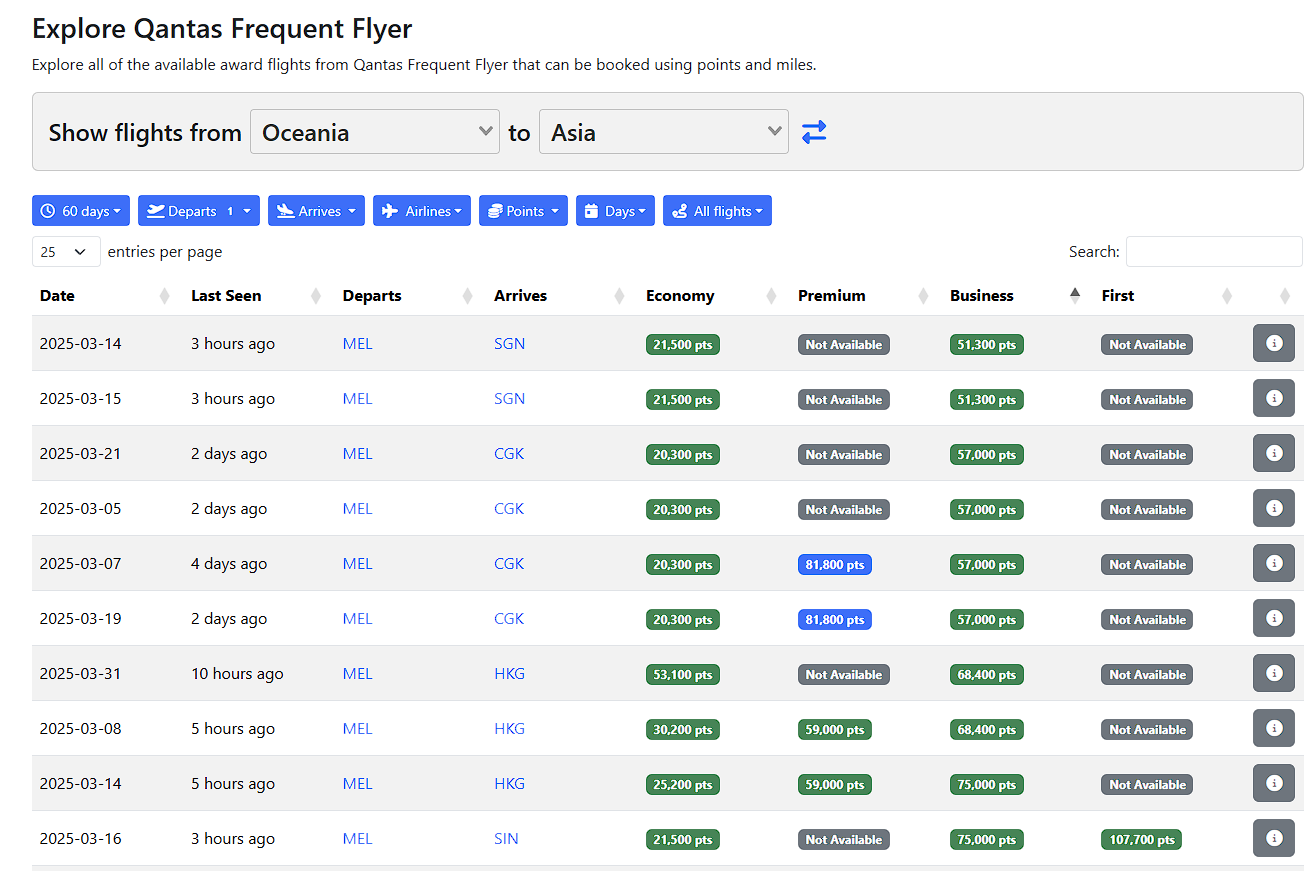 The tool has an Explore feature (shown below) which shows all the available rewrad flights for a particular airline. Look at all of the business class flights available to be booked for flights departing from Melbourne to Singapore, Hong Kong and Indonesia.