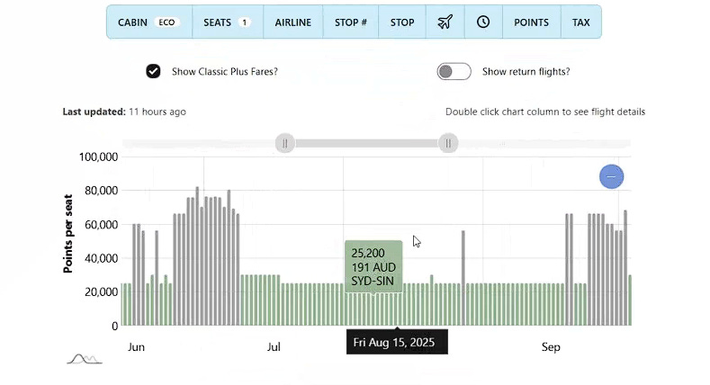 I love the simple interface and the ability to see flights in both chart view (for a holistic view, which is shown below) and table view (for more detailed info). Plus, there are handy filters, including an option to avoid Qantas’s Classic Plus fares.